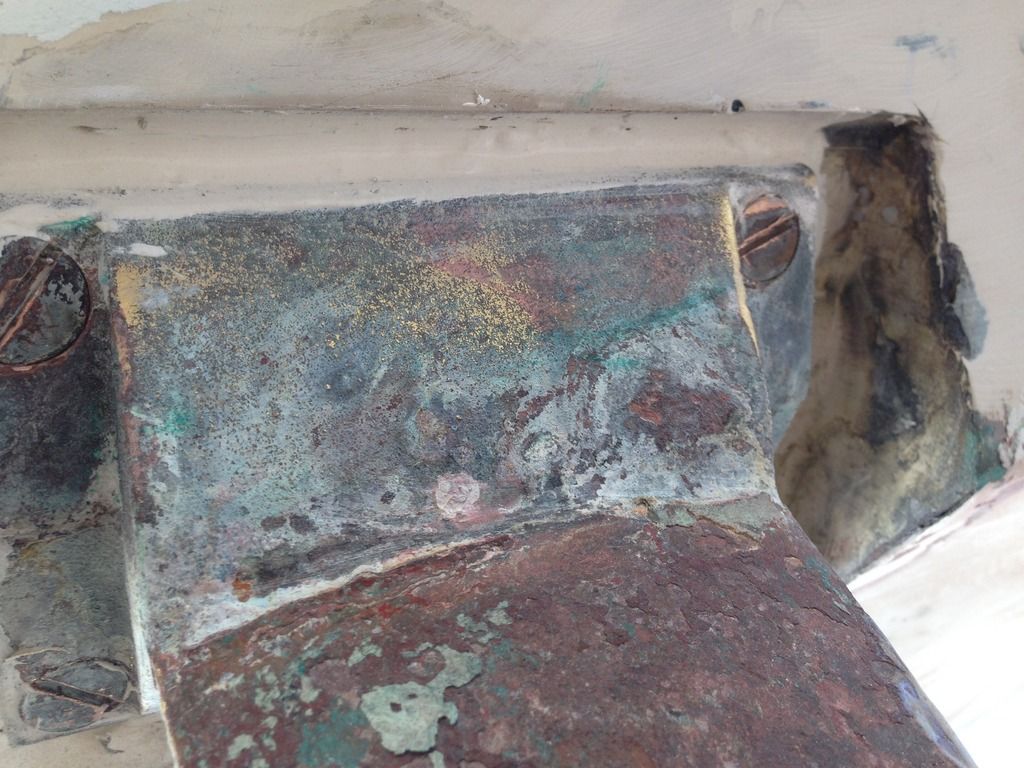 This is what ours looked like on the way back to being reinstalled.  As part of our refit, we pulled it and checked it out for corrosion.  It's a good thing to do while you have the motor out because once it is back in, access is tough.  Ours was faired in with a fairing compound, i.e. fancy expensive marine bondo.