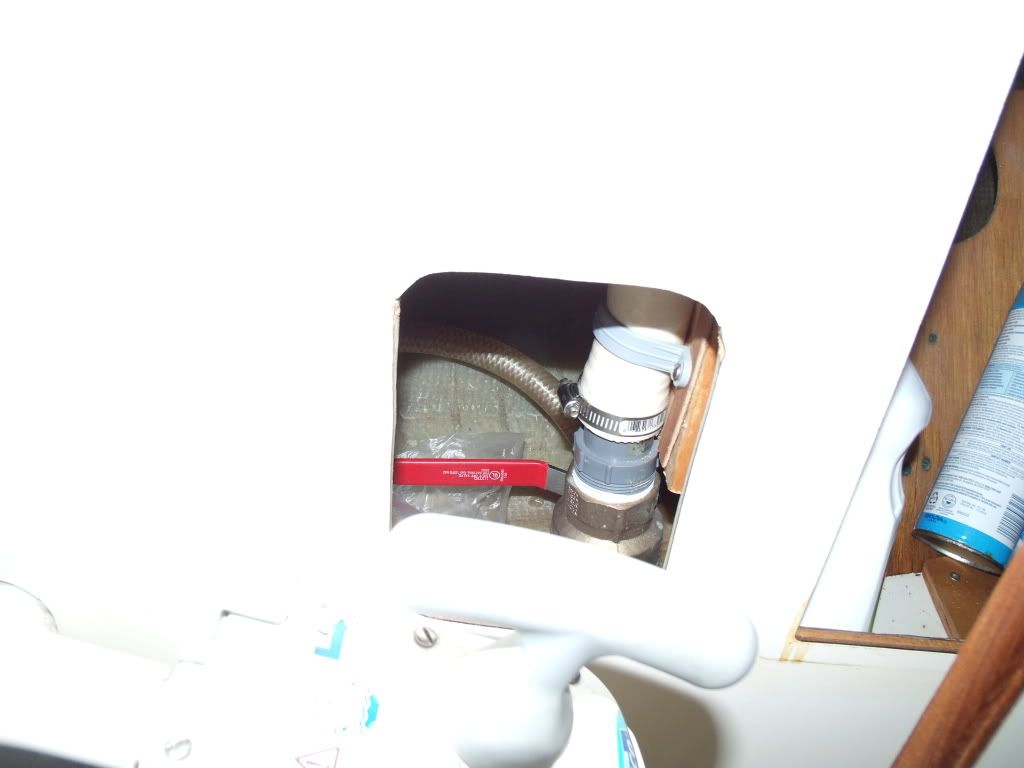 With some difficulty I got rid of the abundance of hose that went up behind the outboard side of the shower and then turned back a couple of miles to the holding tank in the forepeak.  While the boat was on land I installed a 1 1/2" thruhull and seacock at the bottom of the storage space forward of the head sink.  I cut an opening in the cabinet side so that the seacock can be operated while you are on the throne.  Via a Y-valve higher up in the cabinet the waste can be shunted either to the holding tank or to the thruhull – all this shown by my hopefully successful picture attachments.  I fitted an anti-siphon valve just under the top of the cabinet.   This is certainly above the waterline, but not hugely so.  The rules are to keep the discharge seacock closed unless pumping out.